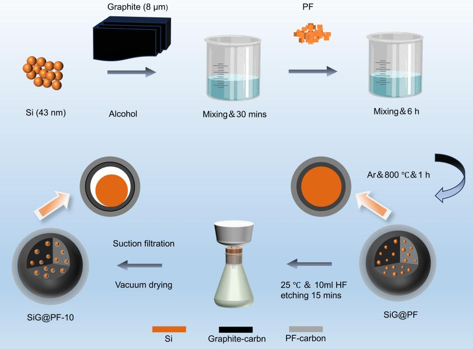 随着电动汽车(EVs)的快速发展,市场对锂离子电池能量密度提出了更高要求,从而推动了新一代高容量负极材料的研发进程。石墨的理论比容量仅为372 mAh g-1,难以满足下一代高能量密度储能系统的需求。在此背景下,硅因其储量丰富、对环境无危害、比容量大(4200 mAh g-1)等优点引起了人们的广泛关注和研究。但是硅基材料在电化学循环过程中产生巨大的体积膨胀会导致颗粒破碎、活性物质的粉化以及从集流体上脱落,从而降低循环性能。纳米化可以抑制硅的体积膨胀,但目前工业方法很难将纳米硅颗粒的尺寸进一步减小。