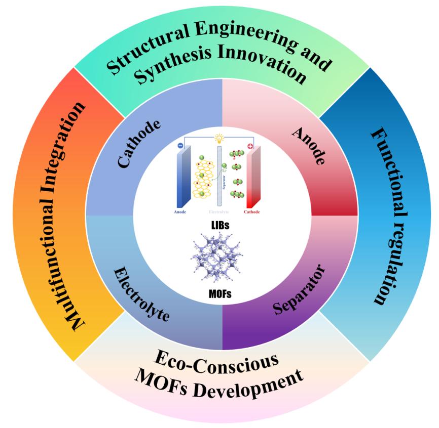 本综述全面介绍了金属有机框架(MOFs)在推动锂离子电池(LIBs)发展中的变革潜力,重点探讨其作为电极、电解质和隔膜的多功能应用。MOFs独特的结构特性——如可调孔隙率、高比表面积和可定制的化学功能——能够显著提升电池的能量密度、离子传输效率和热稳定性。本综述系统阐释了MOFs及其衍生物在锂离子电池四大核心组件——正极、负极、电解质和隔膜中的创新应用机制与性能优化策略。尽管取得这些进展,MOFs材料固有的低导电性、循环过程中的结构降解以及高昂的生产成本仍是关键障碍。针对这些局限性,本文提出了战略性研究方向,包括构建导电网络、开发多功能杂化材料以及探索可持续合成方法,并为利用MOFs设计具有更高性能、安全性和环境可持续性的下一代锂离子电池提供了路线图。