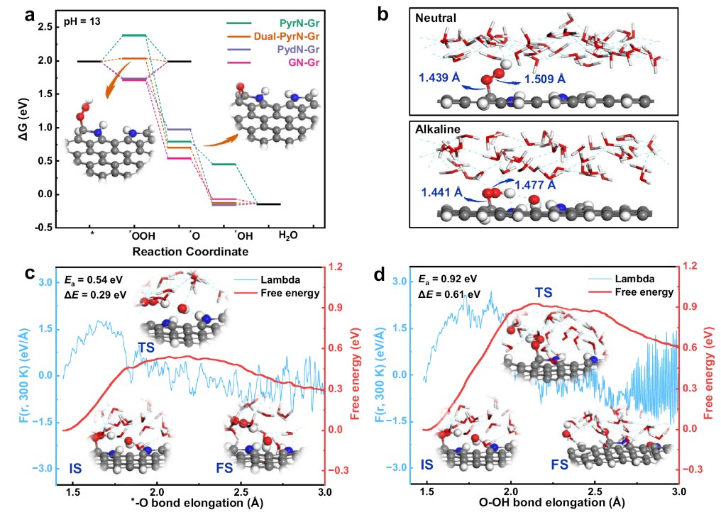 微结构和化学环境测试结果表明:在最佳条件下制得的催化剂实现了最高可达50%的吡咯氮掺杂比例。电化学测试结果表明:富吡咯氮的碳基催化材料具有极高的2e−-ORR活性和选择性。具体为,在−0.6 Vvs.RHE的测试电位下,达到30 mol g−1h−1的H2O2产率,同时表现出80%的法拉第效率。24h的长时长测试可以积累得到7.2 L−1的H2O2。此外,该材料的重复性、稳定性等方面也同样表现出了优异的性能(图1)。理论研究结果表明:双吡咯氮活性中心比石墨氮、吡啶氮和单吡咯氮相比会具有更小的反应过电位(热力学结果)。而双吡咯氮活性中心的两电子反应能垒远低于四电子反应,从而表现出更高的催化性能(动力学结果)(图2)。