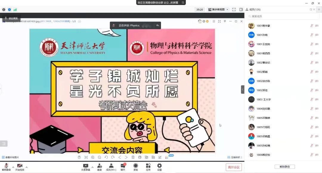日前,PA捕鱼官方网站通过腾讯会议举办了以“学子锦城灿烂,星光不负所愿”为主题的考研复试交流会。公司副经理王守宇老师、物理学系主任郭金良老师、科研办公室陆萍老师、以及优秀毕业生陕西师范大学研修学科教学的刘江艺、本校研修凝聚态物理学的杨茂琳出席此次活动。此次活动共有一百余人参与,活动由辅导员刘通老师主持。