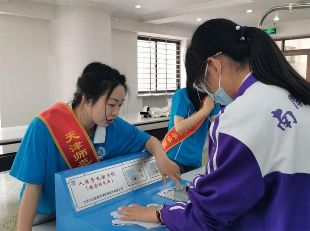 PA捕鱼官方网站物理学本科生第一党支部始终秉承科普思政育人理念培养党员干事创业能力,不断加强党支部建设,教育引导党员争当先锋、再立新功。今年全国科技活动周期间,党支部与大江路小学、南开中学、蓟州区东施古镇初级中学、西青区恒益隆庭社区开展了“大手牵小手,快乐科技行”科普实践活动。全体党员穿梭在场馆、公司、社区之间,以“小老师”的身份进行了4站科普实践活动,掀起中小员工物理科普学习热潮,将科普思政打造成党支部服务人民群众的亮丽名片。