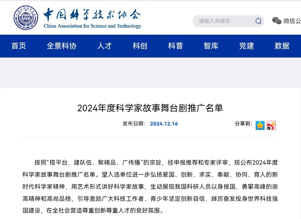 “科学家故事舞台剧推广行动”由中国科协、教育部、共青团中央等共同主办,由中国科协牵头面向全社会征集科学家故事舞台剧,推广行动以“搭平台、建队伍、聚精品、广传播”为宗旨,按照科学性与艺术性相结合的要求,用艺术的形式讲好科学家故事,旨在全社会营造尊重创新、尊重人才的良好氛围。